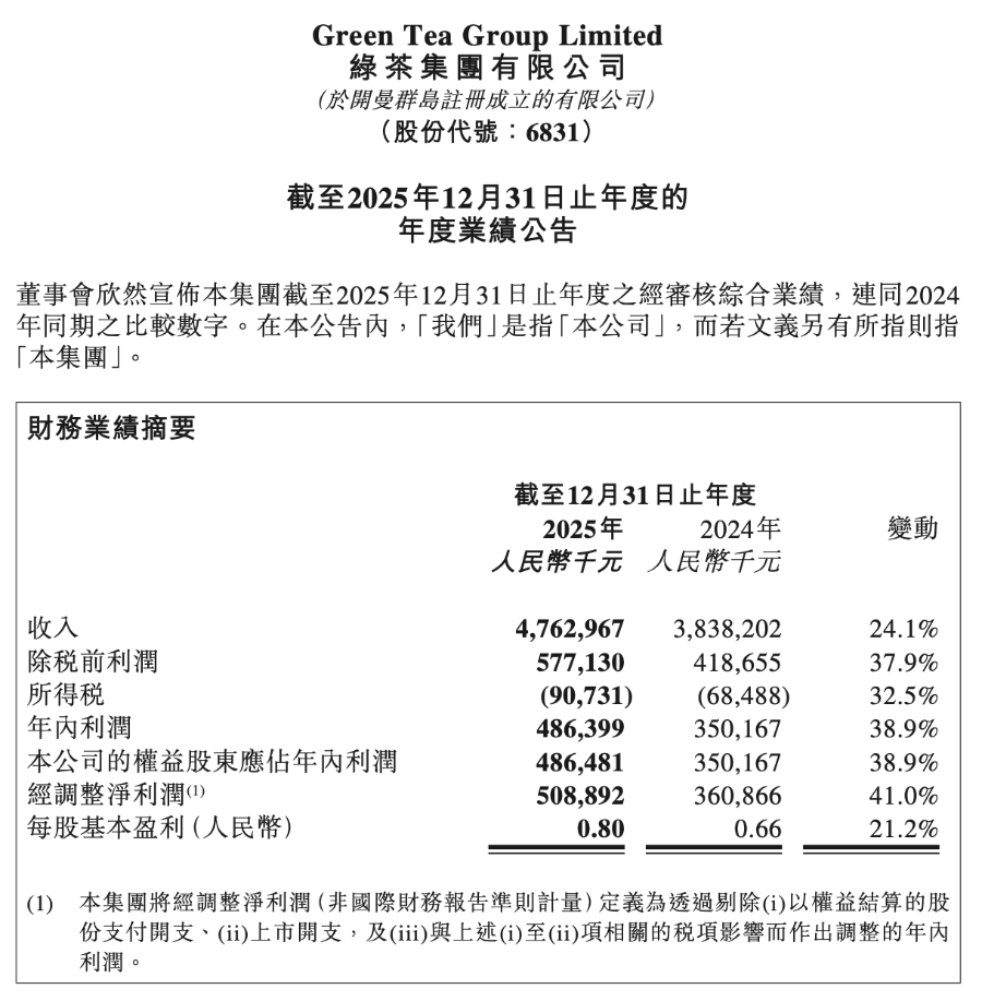 3月23日晚,绿茶集团败露,2025年全年竣事营收47.63亿元(东谈主民币,下同),同比增长24.1%,公司权力股东应占年内利润4.86亿元,同比增长38.9%,经调遣净利润5.09亿元,同比增长41.0%。